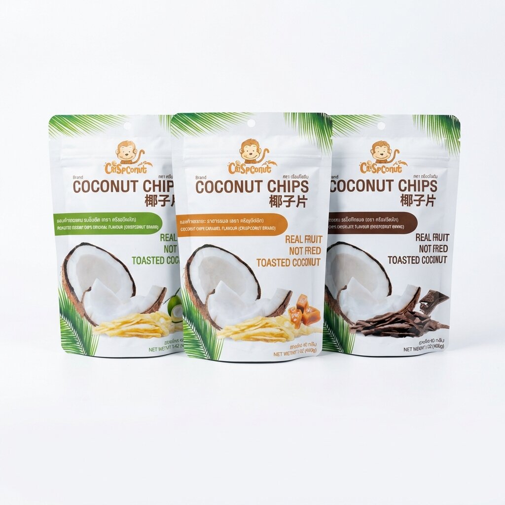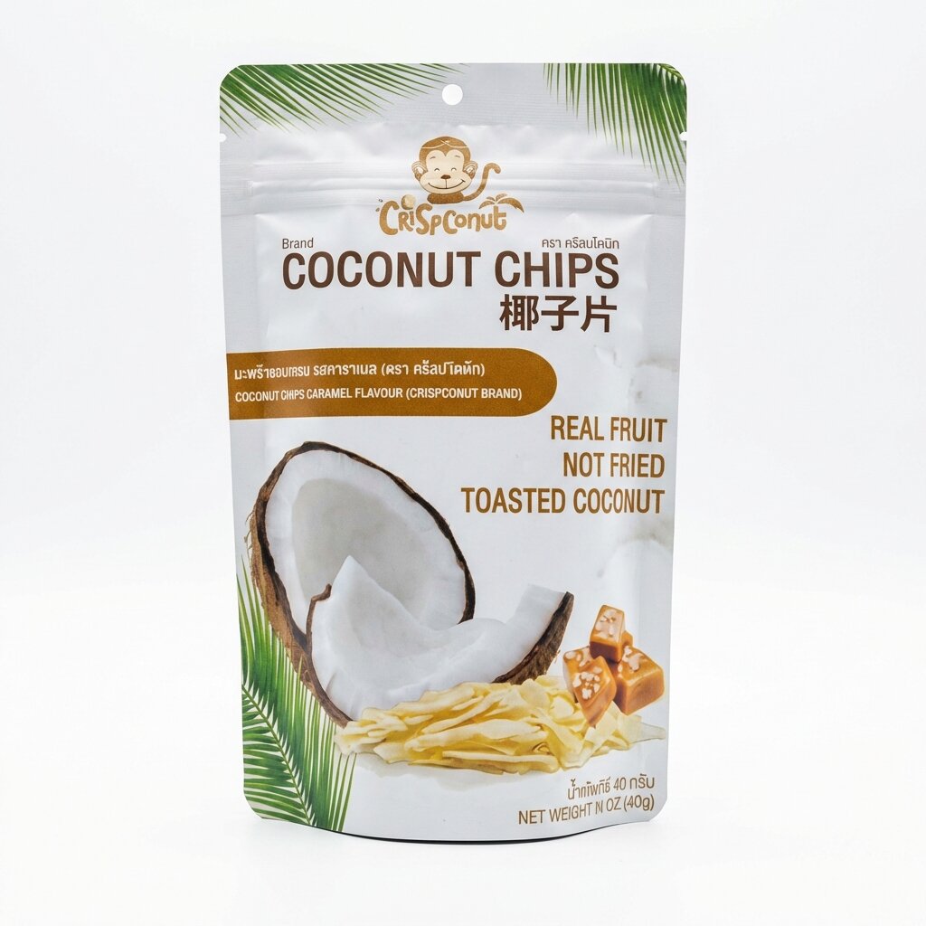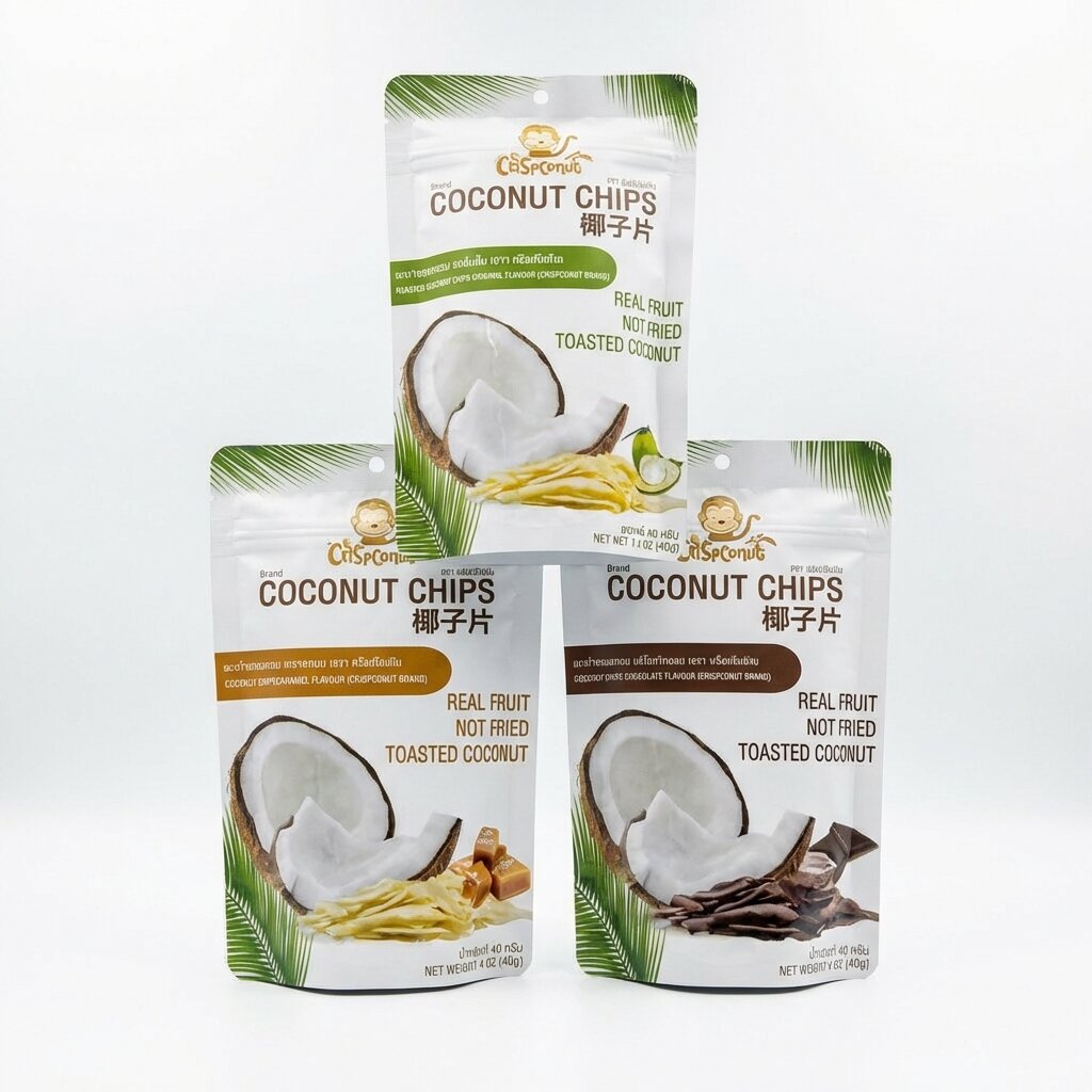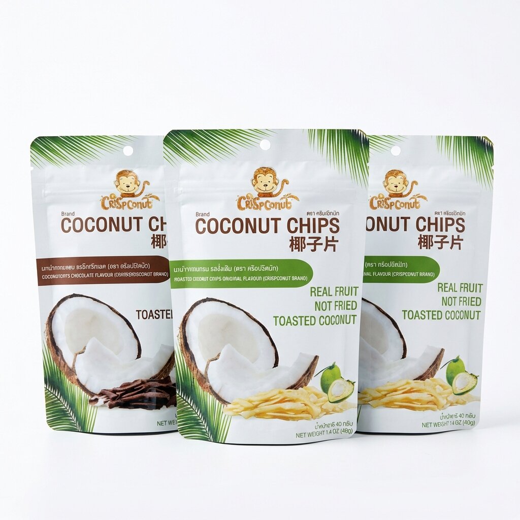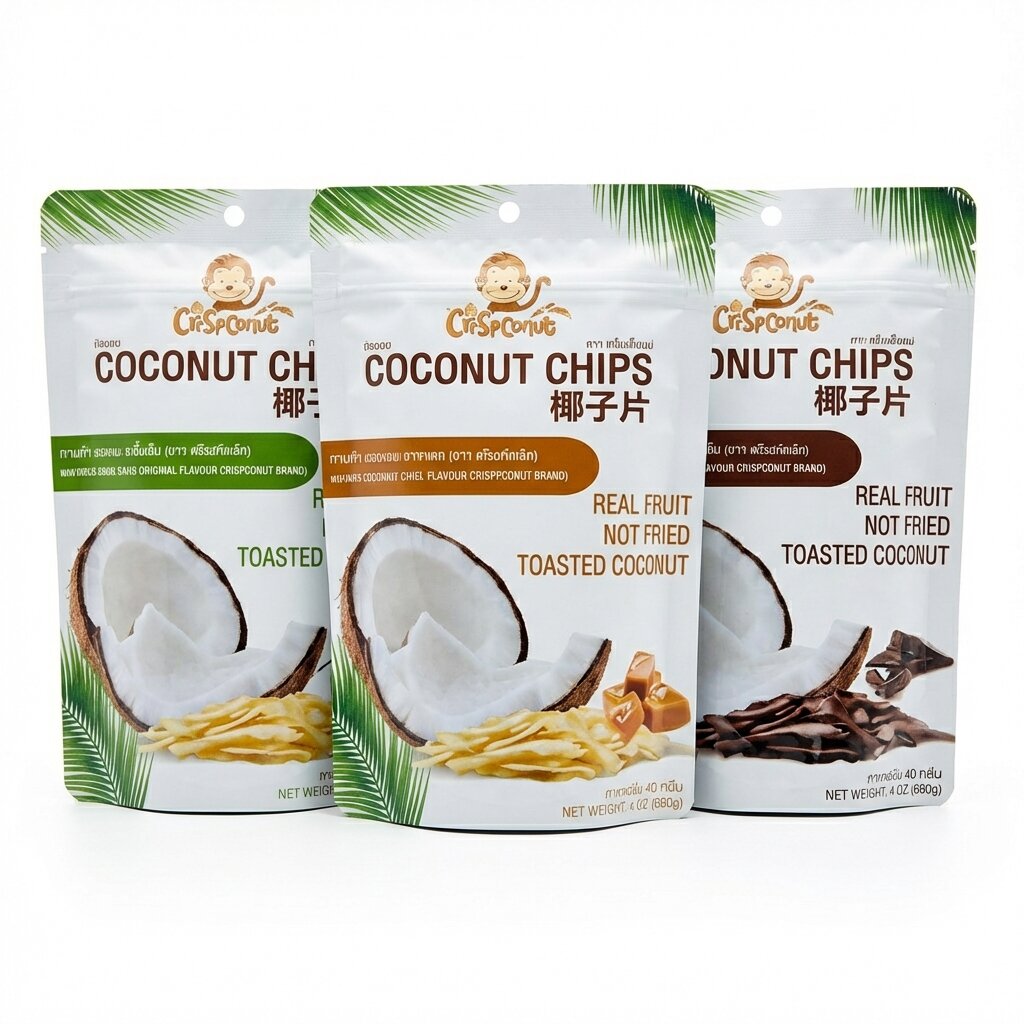 - 100% Натуральный состав: Изготовлены из свежей мякоти отборных тайских кокосов, обжаренной до золотистого хруста по традиционному аутентичному рецепту.