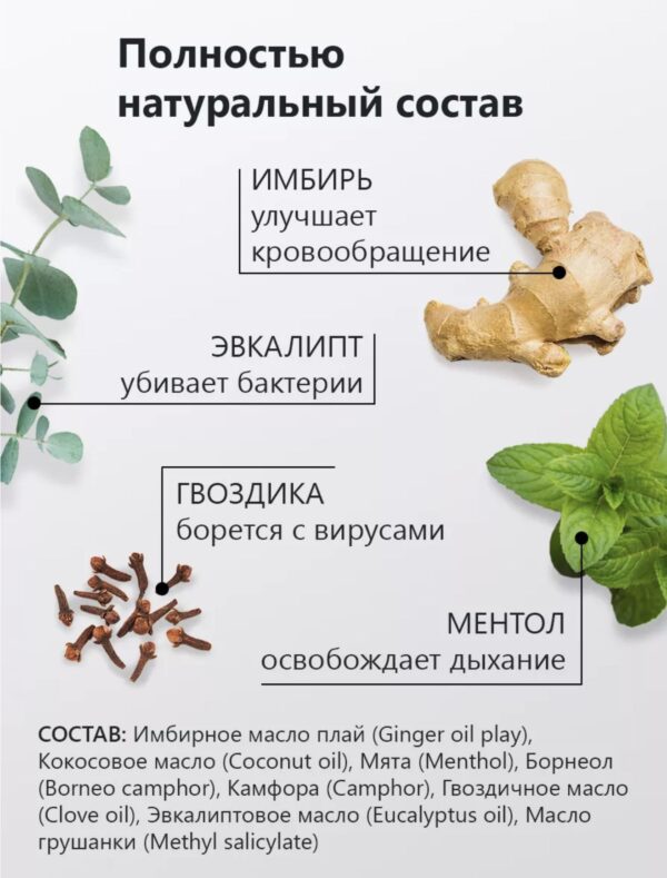 Также в составе для комплексного воздействия присутствуют: масло плая (Zingiber cassumunar), масло пачули (Pogostemon cablin), экстракты куркумы яванской (Curcuma xanthorrhiza), имбиря (Zingiber officinale), эвкалипта (Eucalyptus globulus) и ментол.