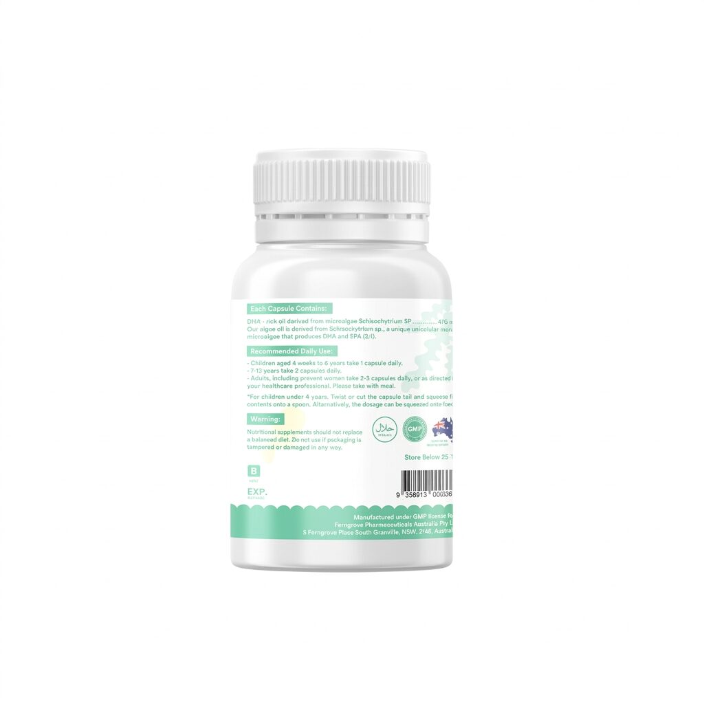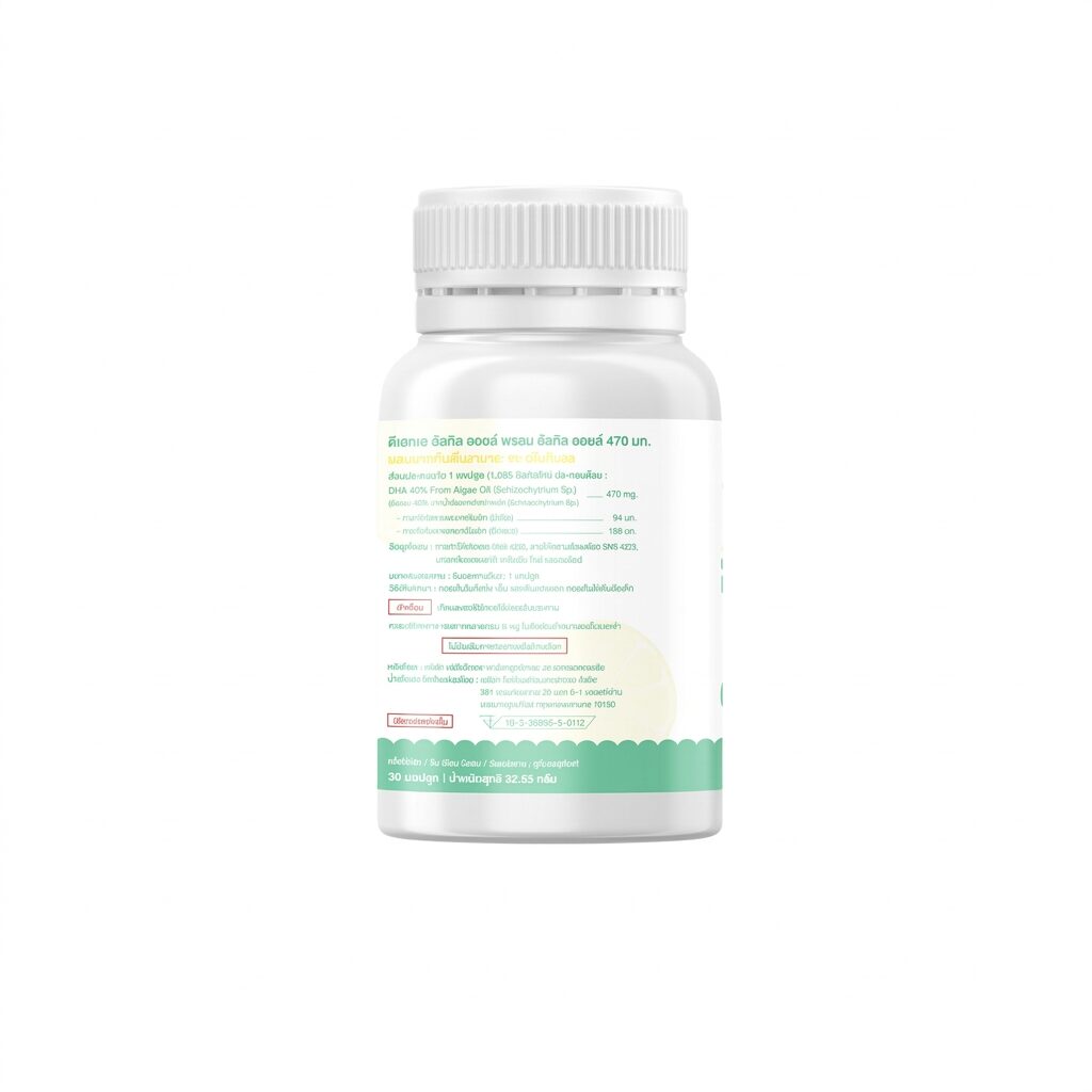 - Содержание активных веществ: Концентрированный продукт содержит 470 мг масла водорослей, что эквивалентно 188 мг чистого ДГК (DHA).