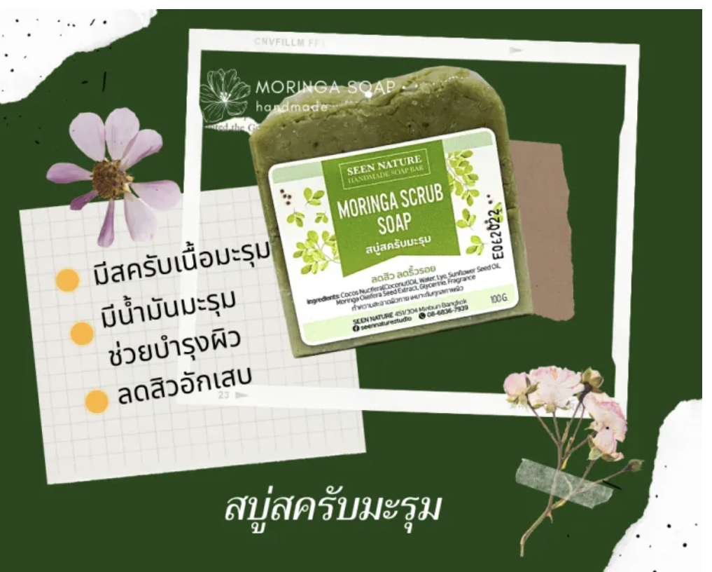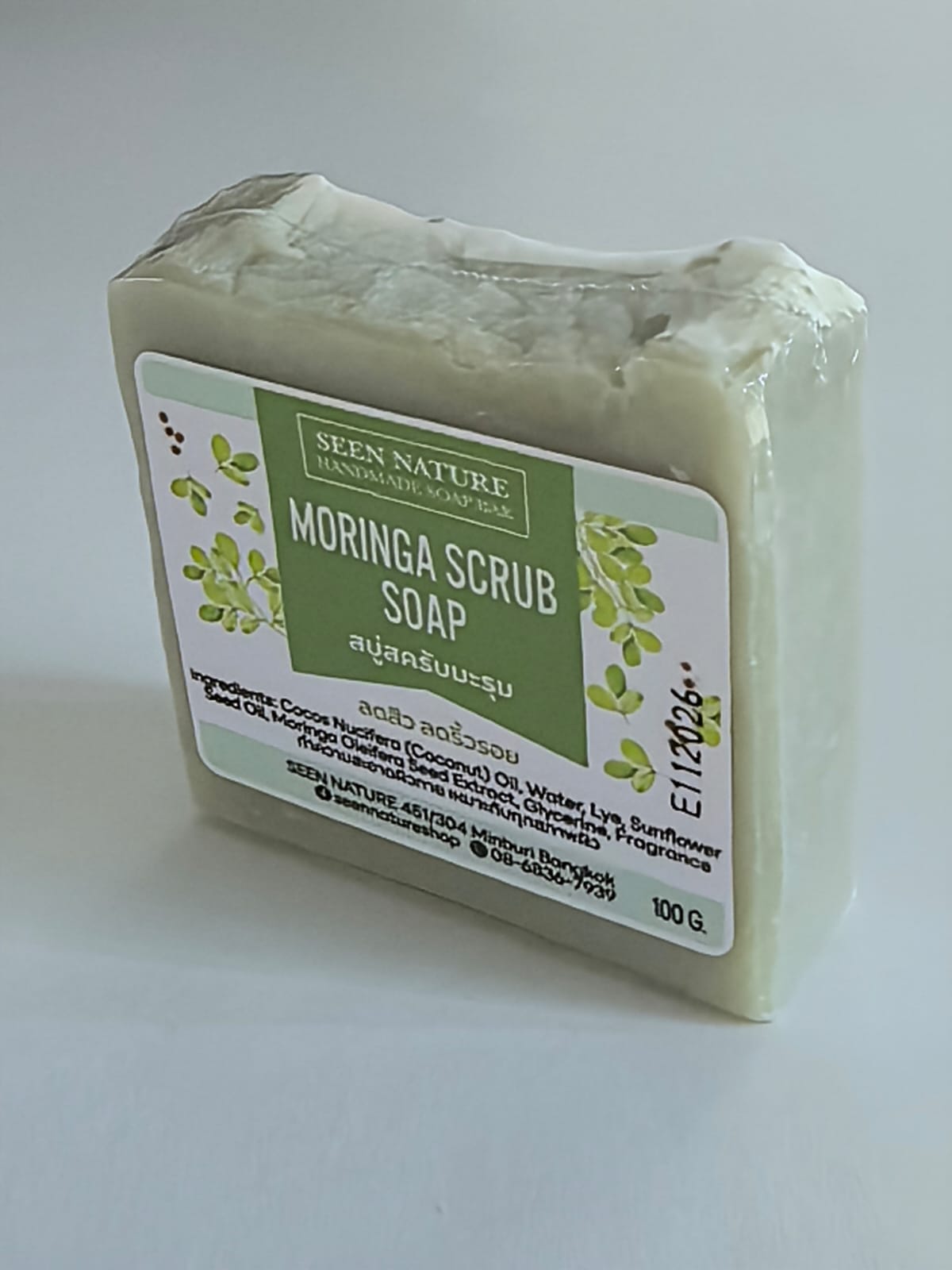 Скраб-мыло с морингой, изготовленный из натуральных ингредиентов, питает кожу. Текстура скраба нежная и неабразивная, с освежающим ароматом.
