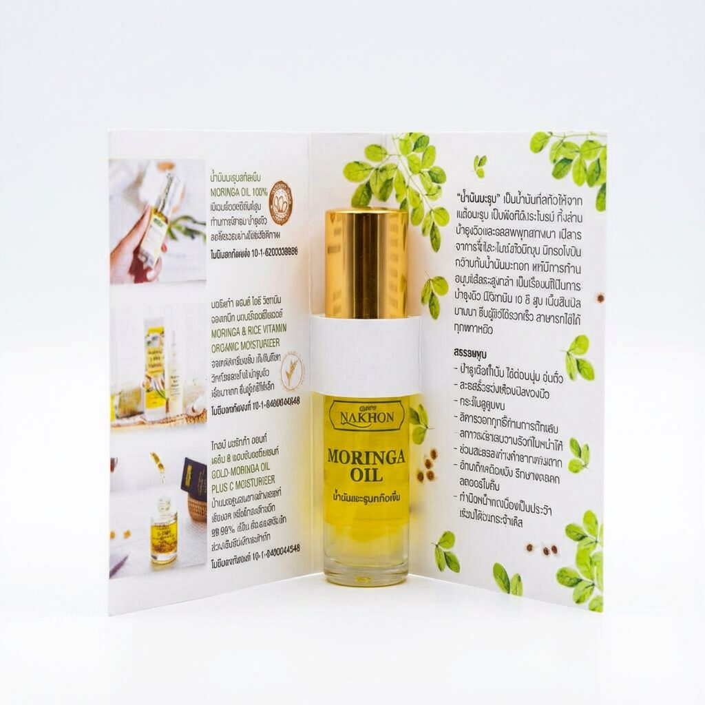 Масло моринги быстро распределяется по поверхности кожи, превосходно впитывается и мгновенно смягчает ее. Его уникальный жирнокислотный состав, с преобладанием олеиновой кислоты, обеспечивает глубокое питание и увлажнение. Масло богато фитостеролами, обладающими противовоспалительным и заживляющим действием, и токоферолами (витамин Е), которые защищают клетки кожи от окислительного стресса. Это делает масло моринги незаменимым средством для увядающей кожи, оно улучшает цвет лица, придает сияние тусклой и «уставшей» коже. Оно также эффективно балансирует выработку кожного себума, что делает его подходящим и для жирной кожи.