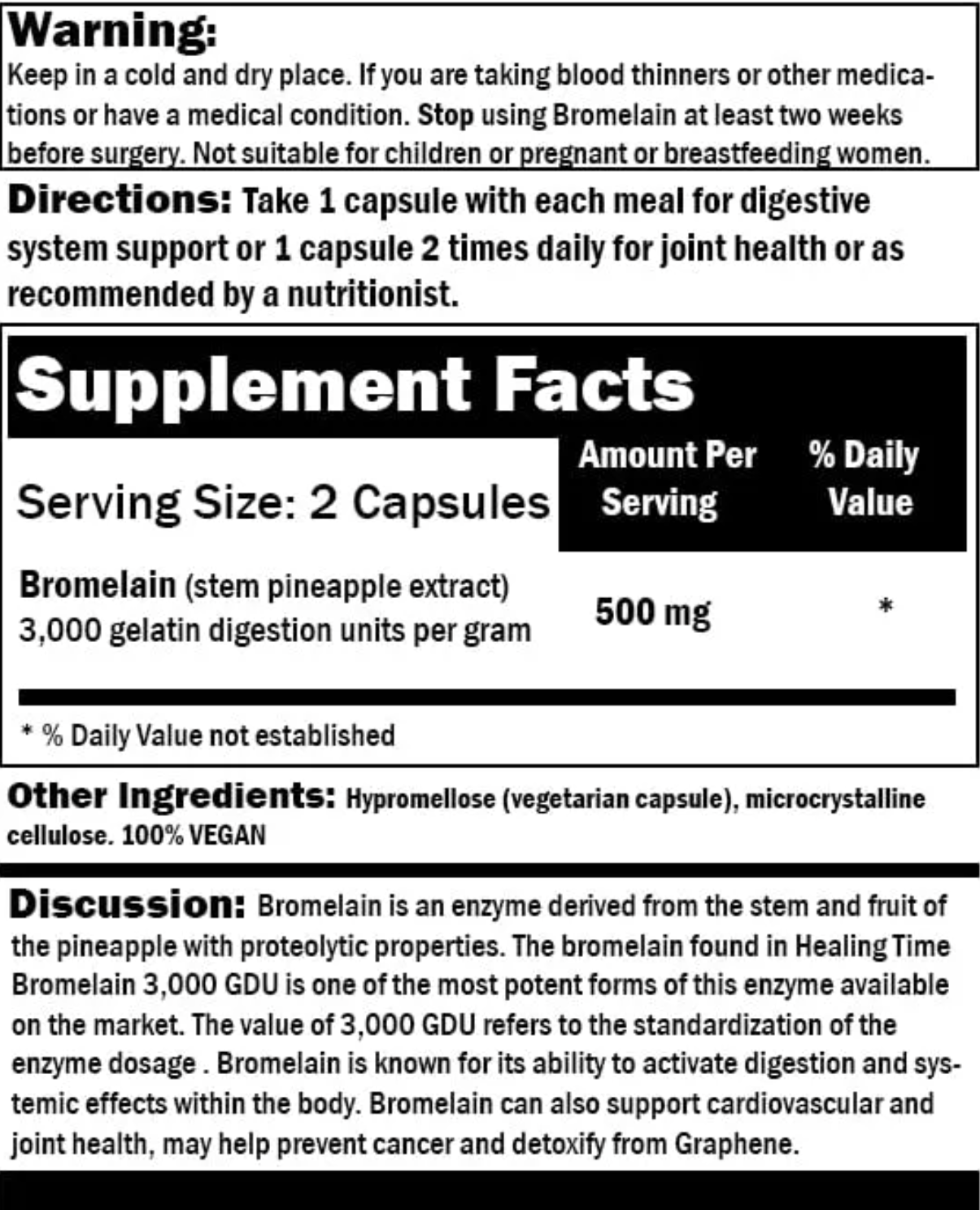 Меры предосторожности и противопоказания: Продукт не рекомендуется к употреблению лицам с индивидуальной непереносимостью ананаса или его компонентов. С особой осторожностью следует принимать добавку людям с нарушениями свертываемости крови, так как бромелайн обладает разжижающим эффектом и может повышать риск кровотечений. Перед началом приема при наличии хронических заболеваний желудочно-кишечного тракта (язвенный колит, болезнь Крона) необходима консультация врача.