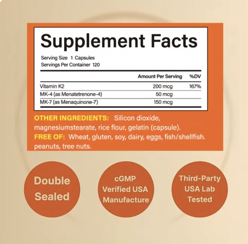 Витаминная добавка K2 полного спектра действия с MK-7 и MK-4, в оптимальной высокой дозе 200 мкг