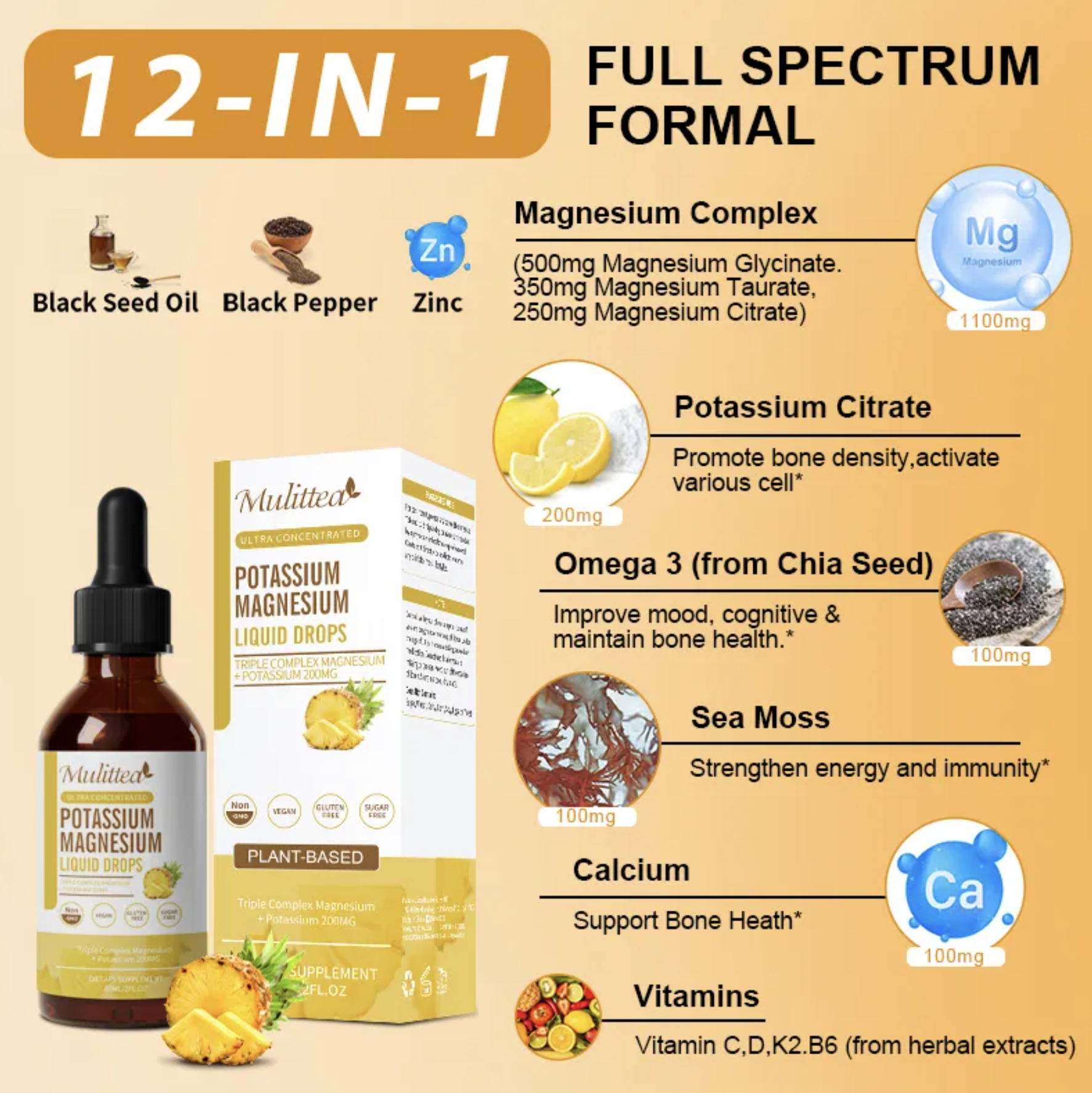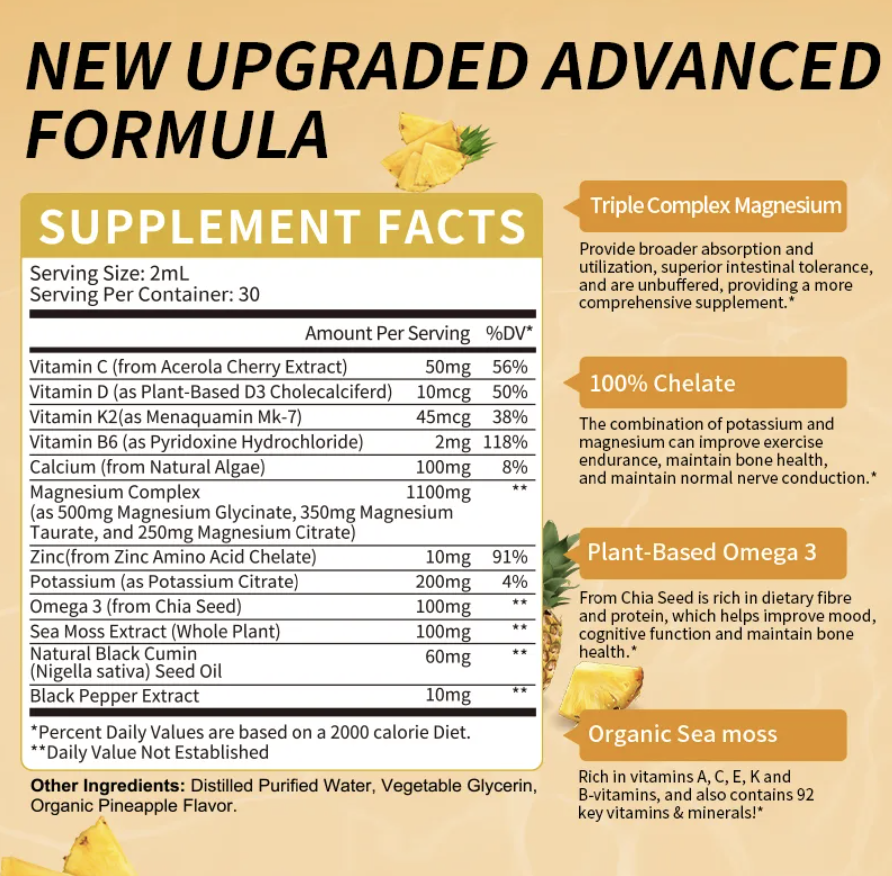 Ключевые компоненты: Кальций (растительного происхождения), магния глицинат, цинк, калий, витамин C, витамин D3, витамин K2, морской мох (Irish Moss).