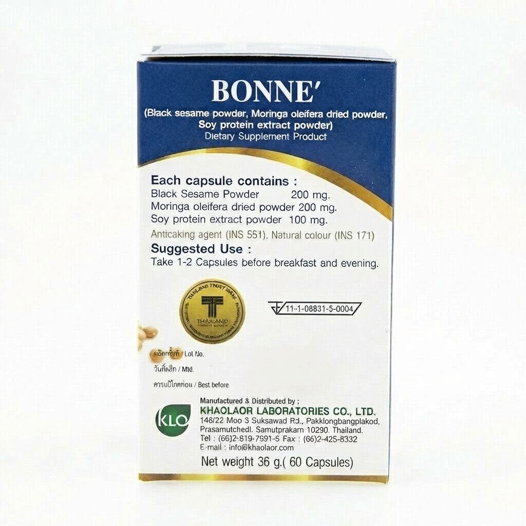 Bonne Khaolaor – это тщательно сбалансированный комплекс из сердца Таиланда, созданный для тех, кто осознанно подходит к заботе о здоровье своих костей и стремится к активному, полноценному долголетию. Этот продукт от сертифицированного производителя Khaolaor объединяет вековую мудрость восточной медицины и современные научные знания, концентрируя силу трех мощных натуральных компонентов: порошка семян черного кунжута, порошка листьев моринги и экстракта соевого протеина. Вместе они обеспечивают вашему организму всестороннюю поддержку.