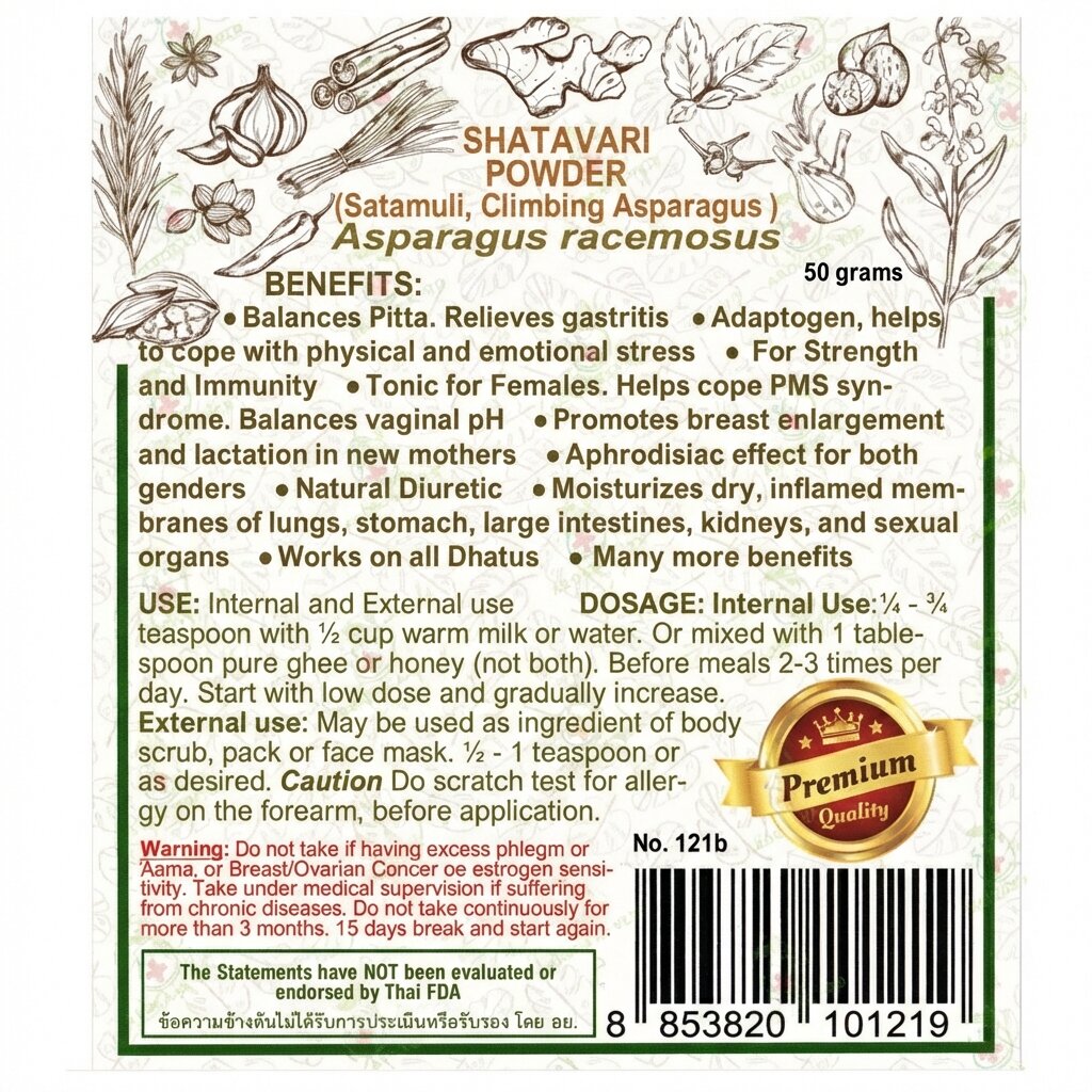 - 100% натуральный состав: Чистый порошок растения Шатавари без масел, спирта, сульфатов и вредных добавок для безопасного применения.