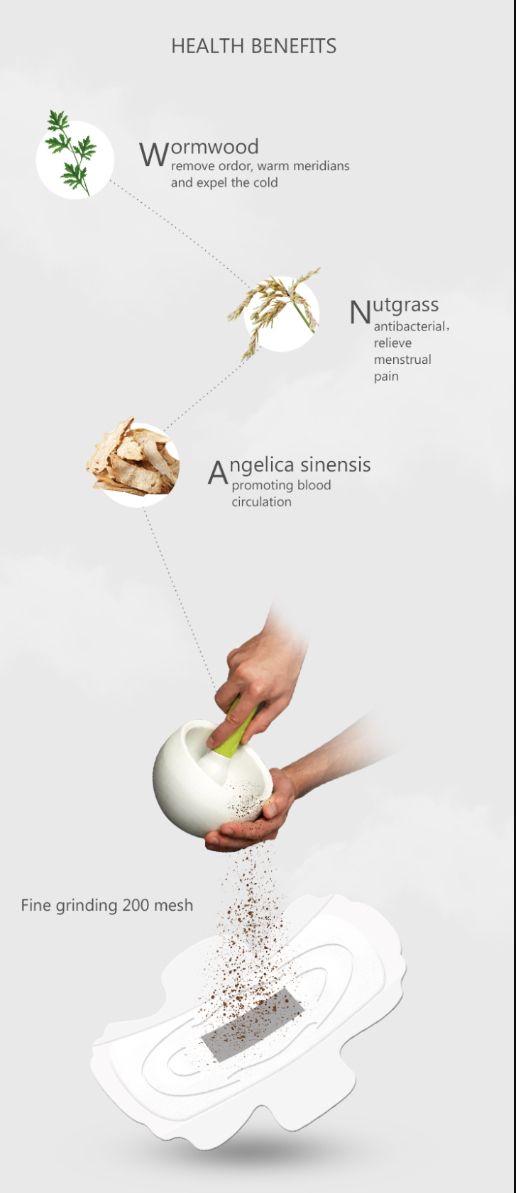 Основой продукта выступает специальный травяной слой, объединяющий экстракты целебных растений, подобранные для поддержания женского здоровья. Полынь отвечает за устранение бактерий и длительное ощущение свежести. Анжелика (дудник) способствует локальному улучшению кровообращения, что помогает снизить общую утомляемость и вернуть жизненную энергию. Экстракт сыти круглой (Cyperus Rotundus) целенаправленно действует на расслабление, успокаивая тянущие боли внизу живота.